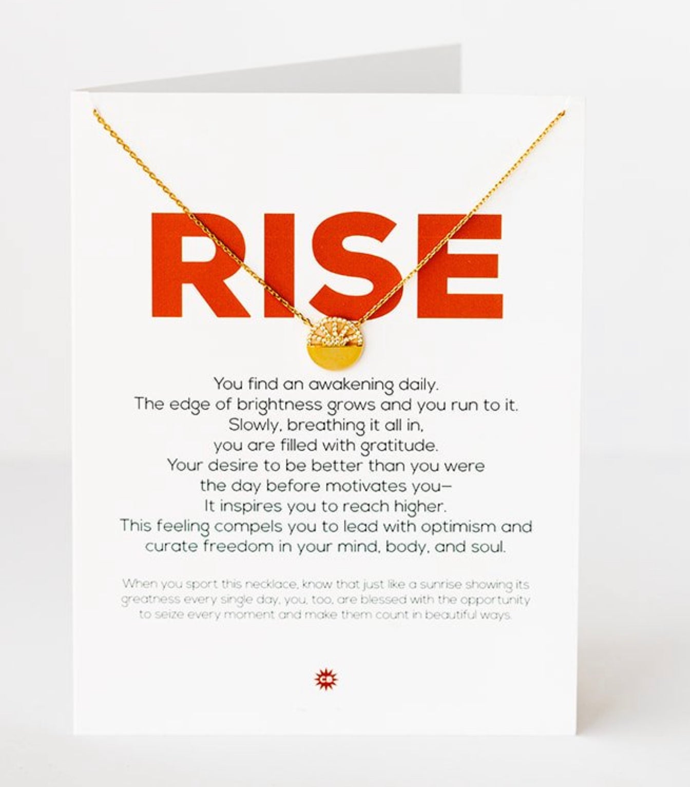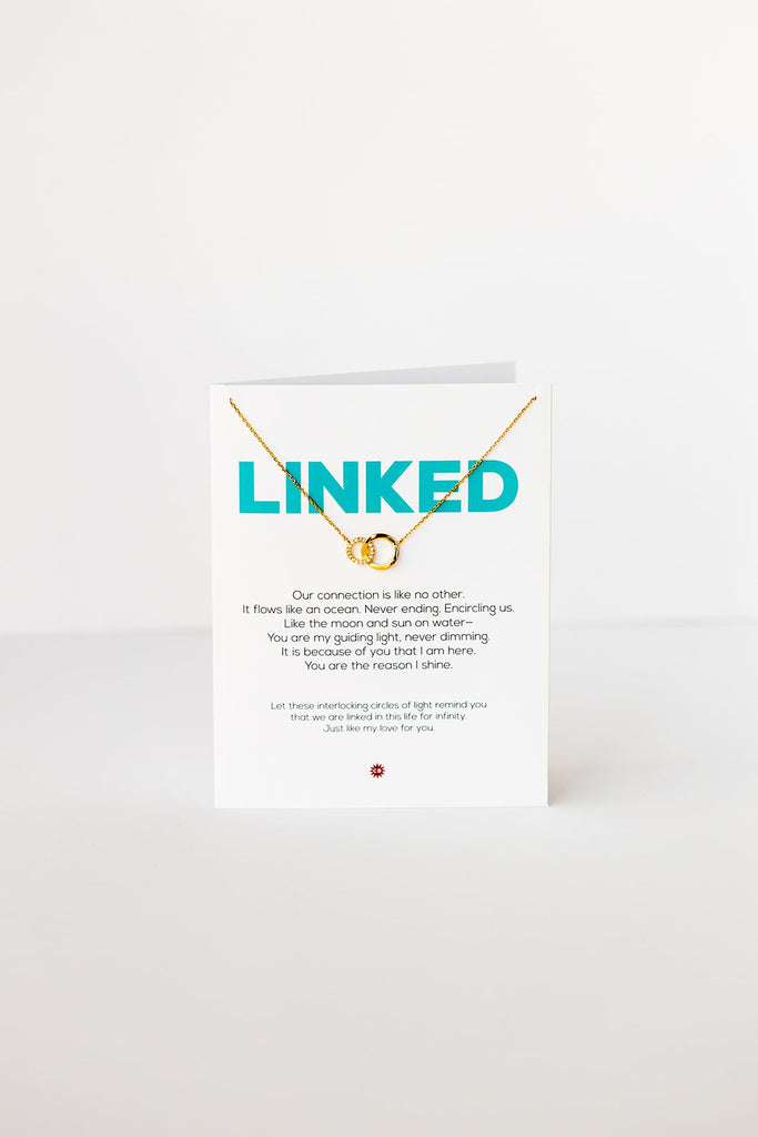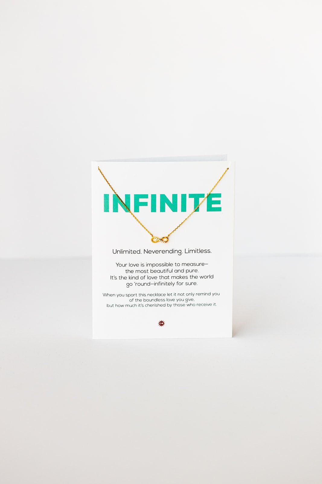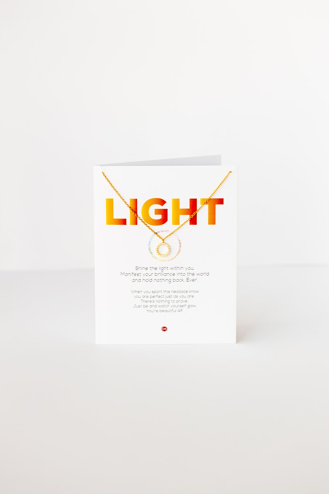 - necklace hangs on a 4.25 X 5.5 greeting card with gold metallic envelope
