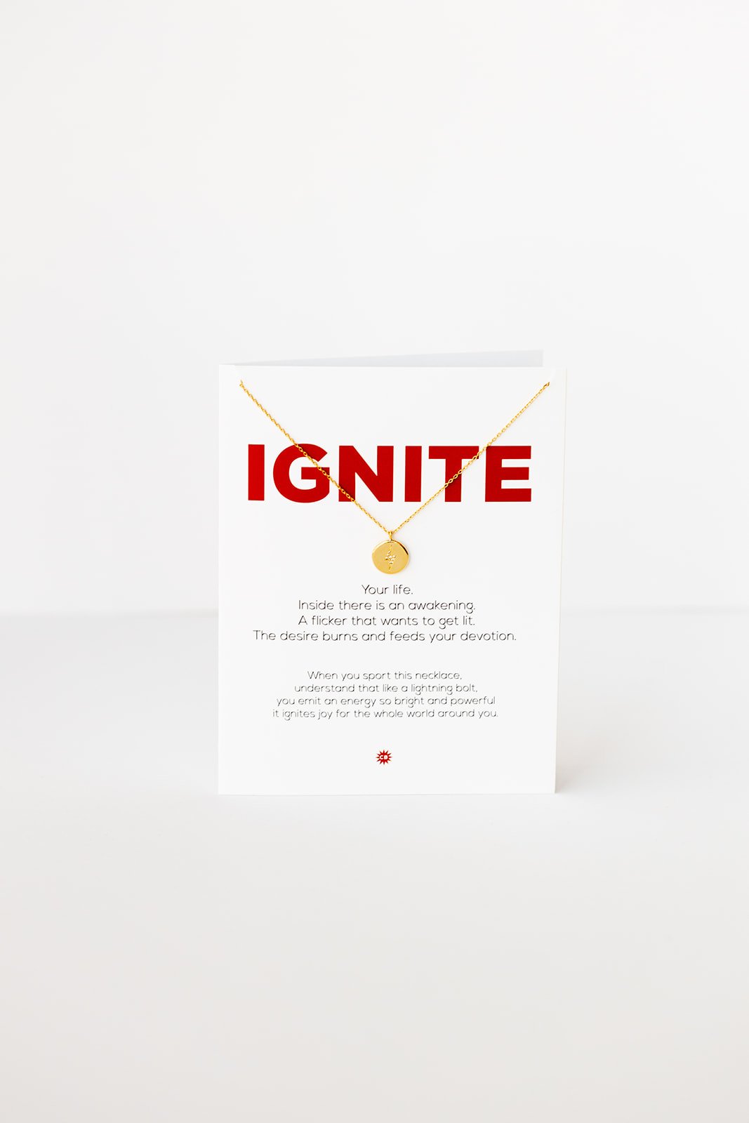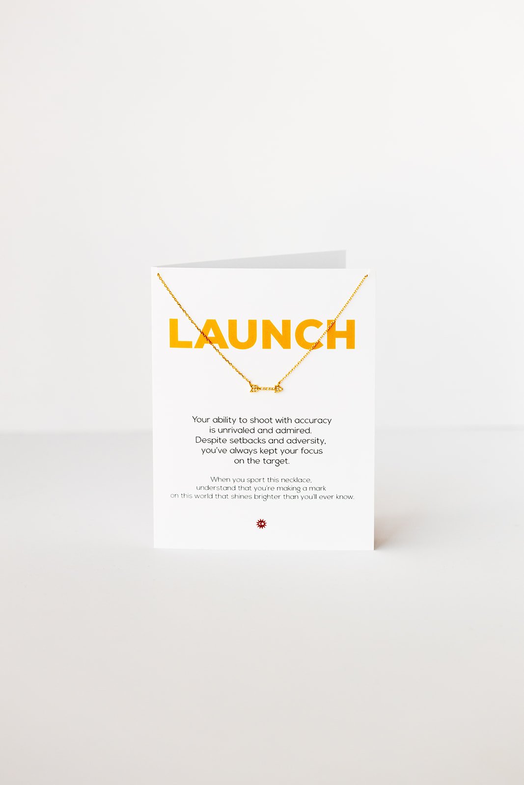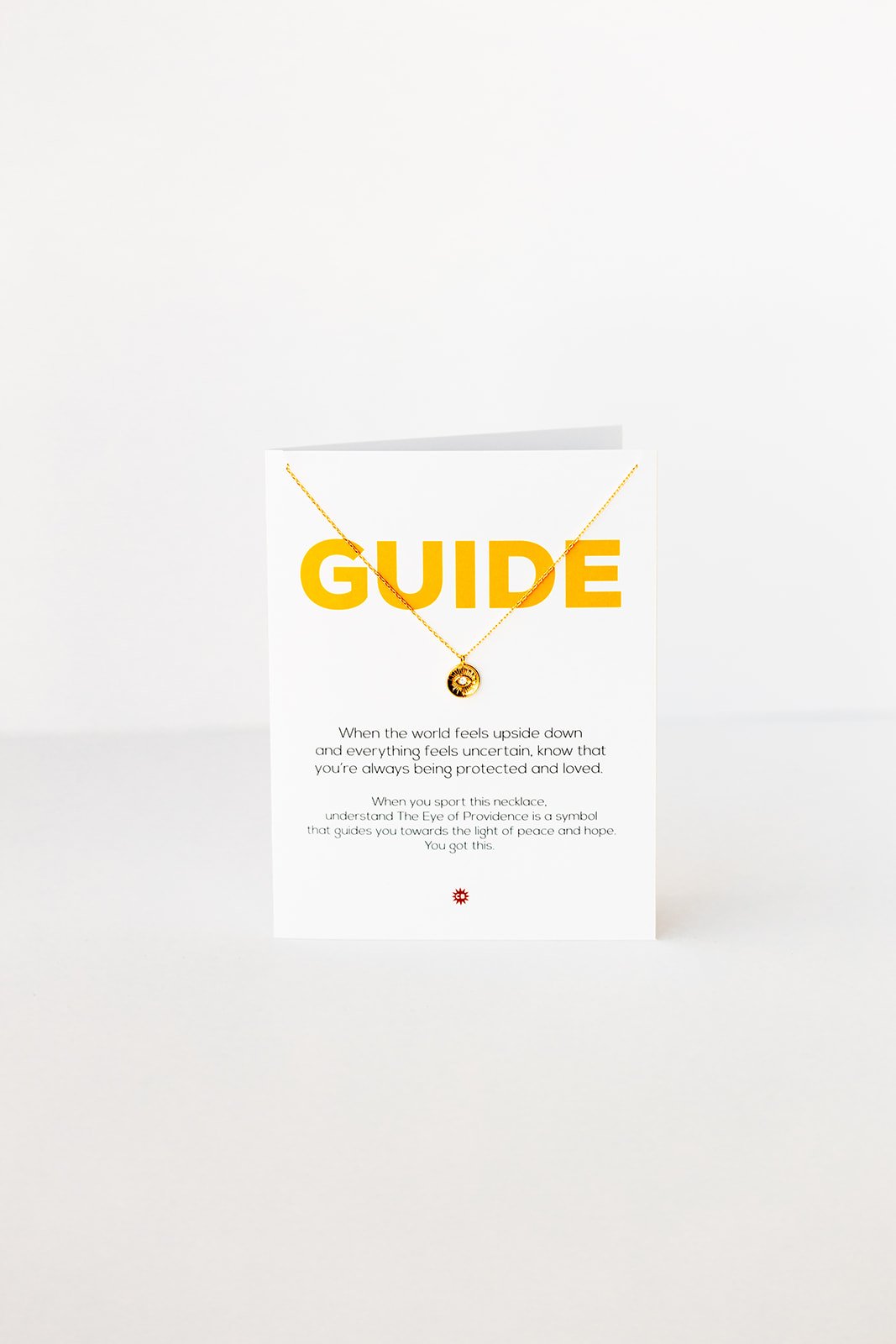 - necklace hangs on a 4.25 X 5.5 greeting card with gold metallic envelope