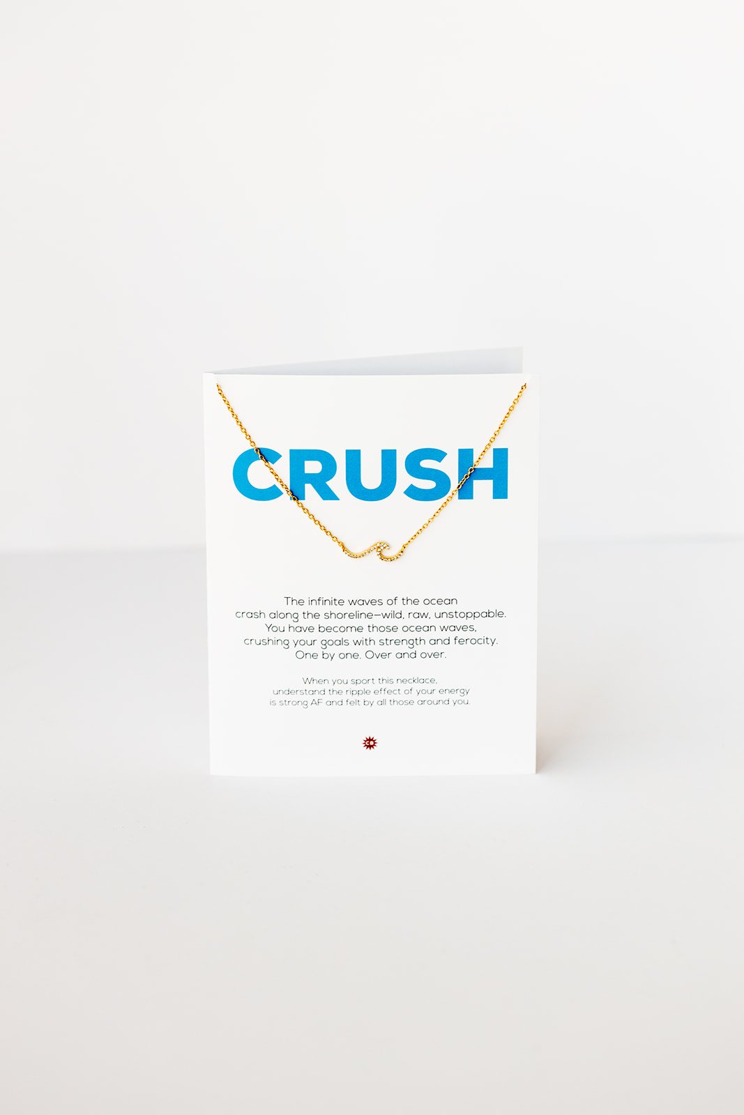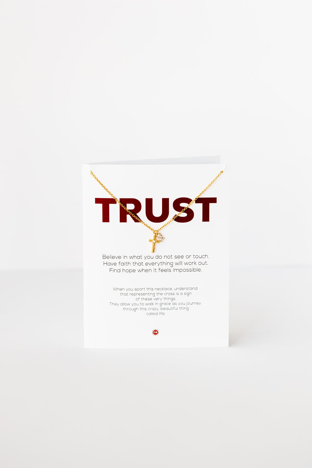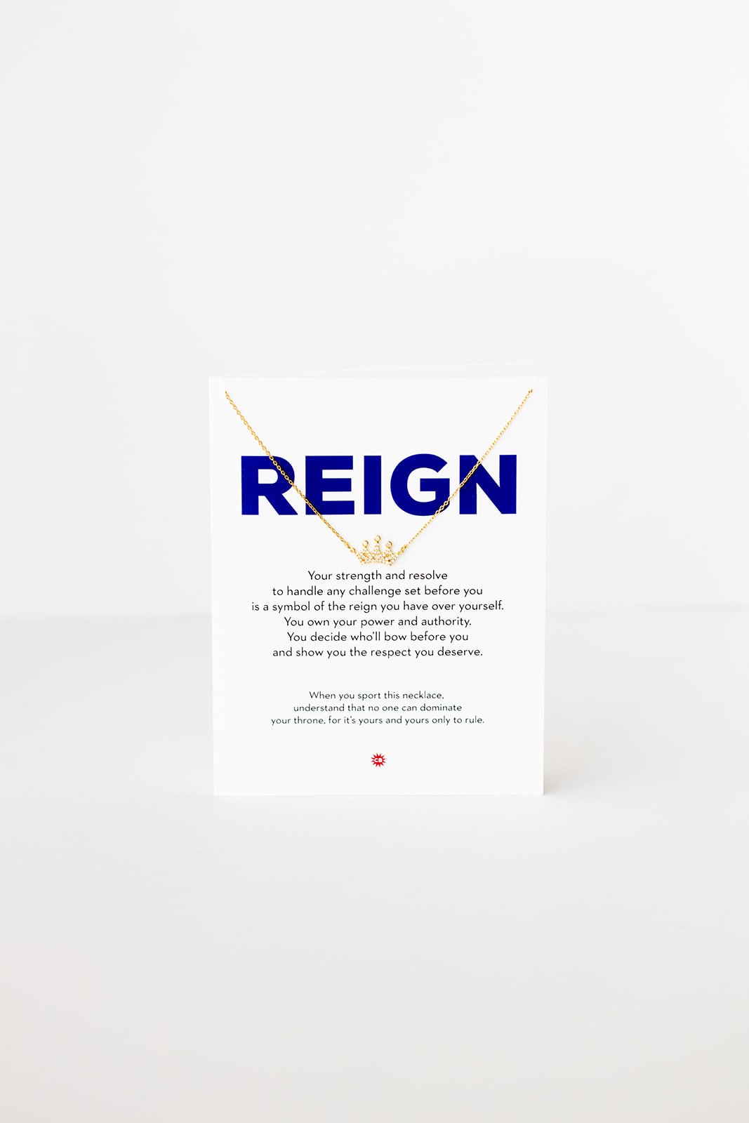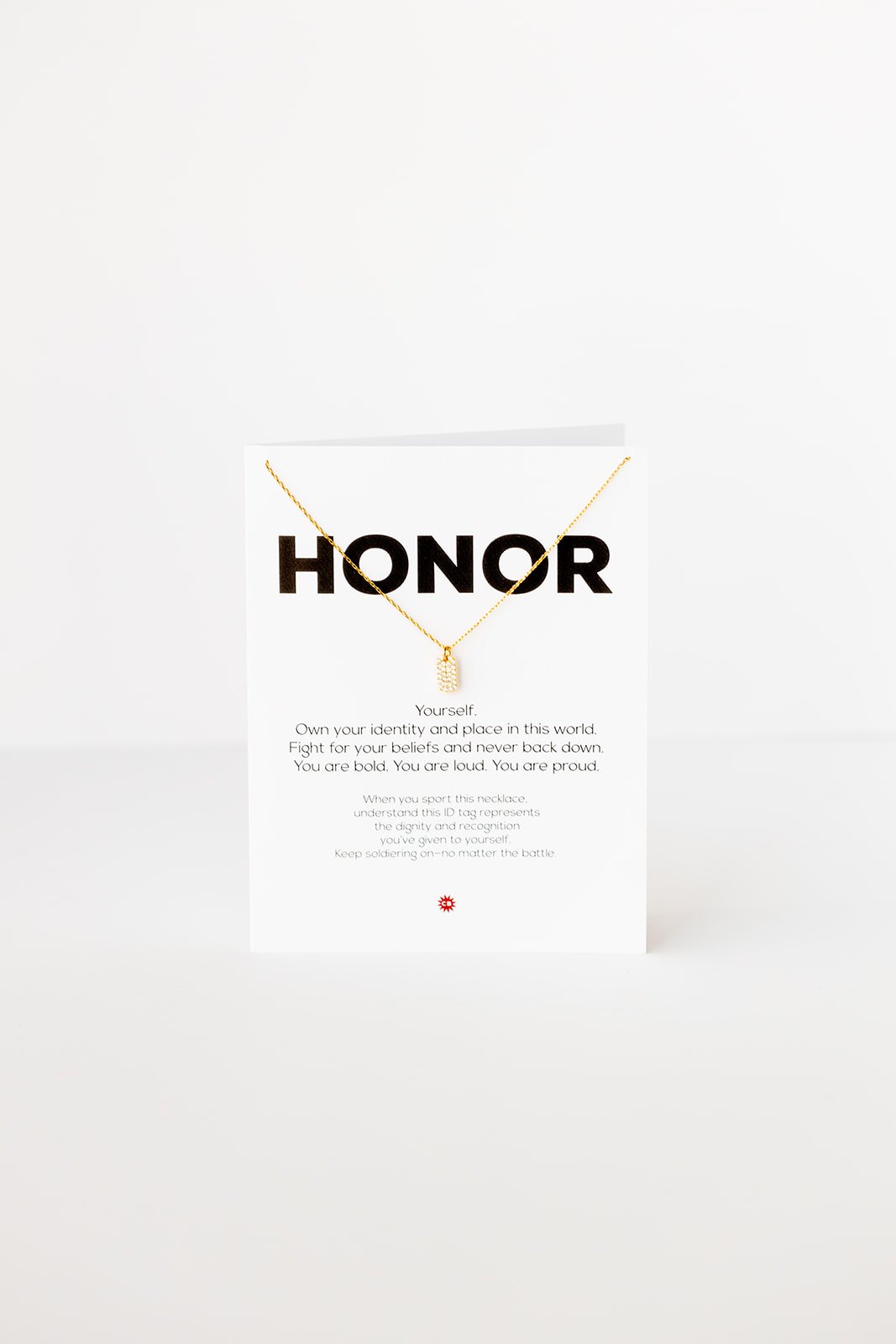 - necklace hangs on a 4.25 X 5.5 greeting card with gold metallic envelope